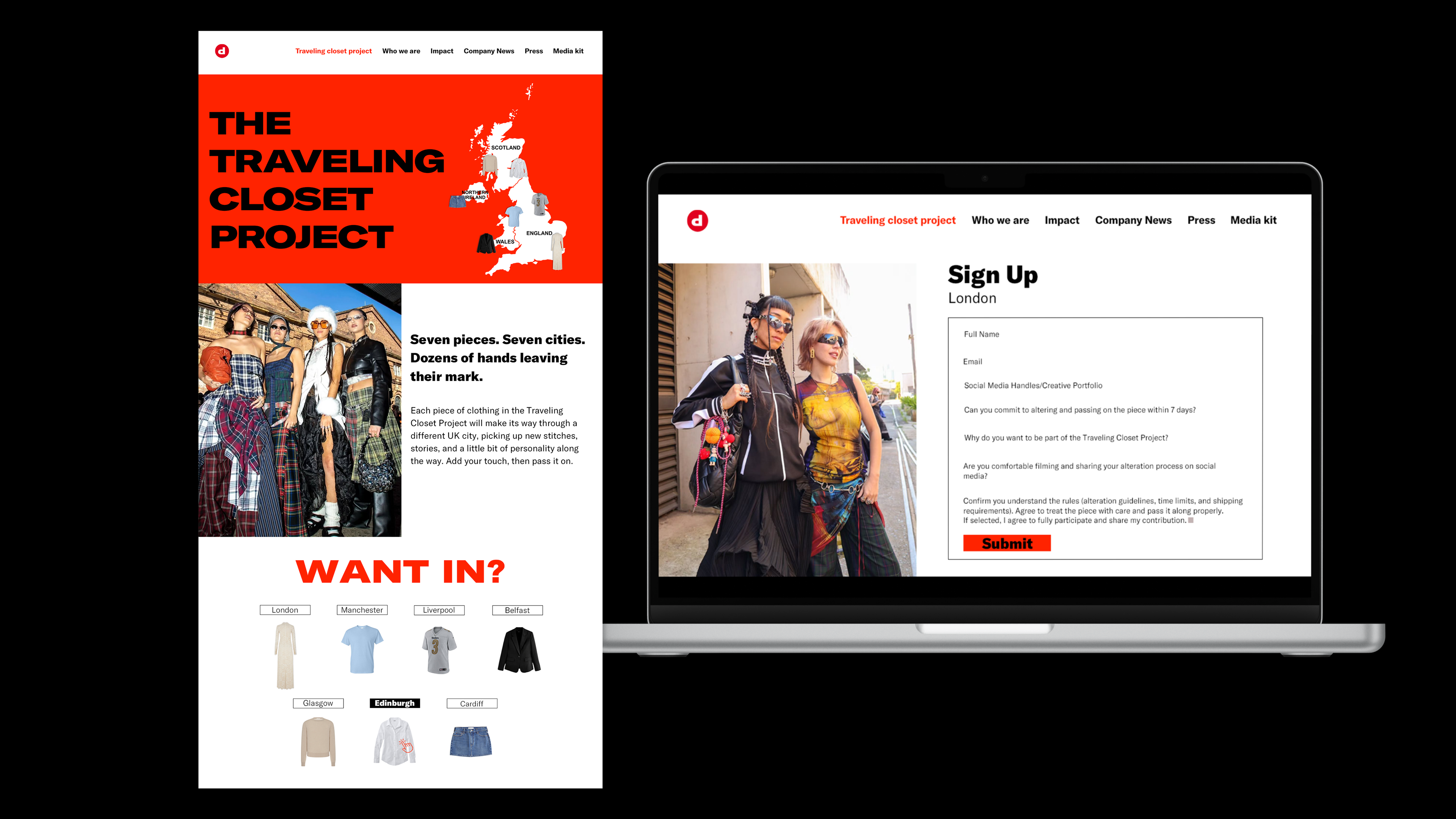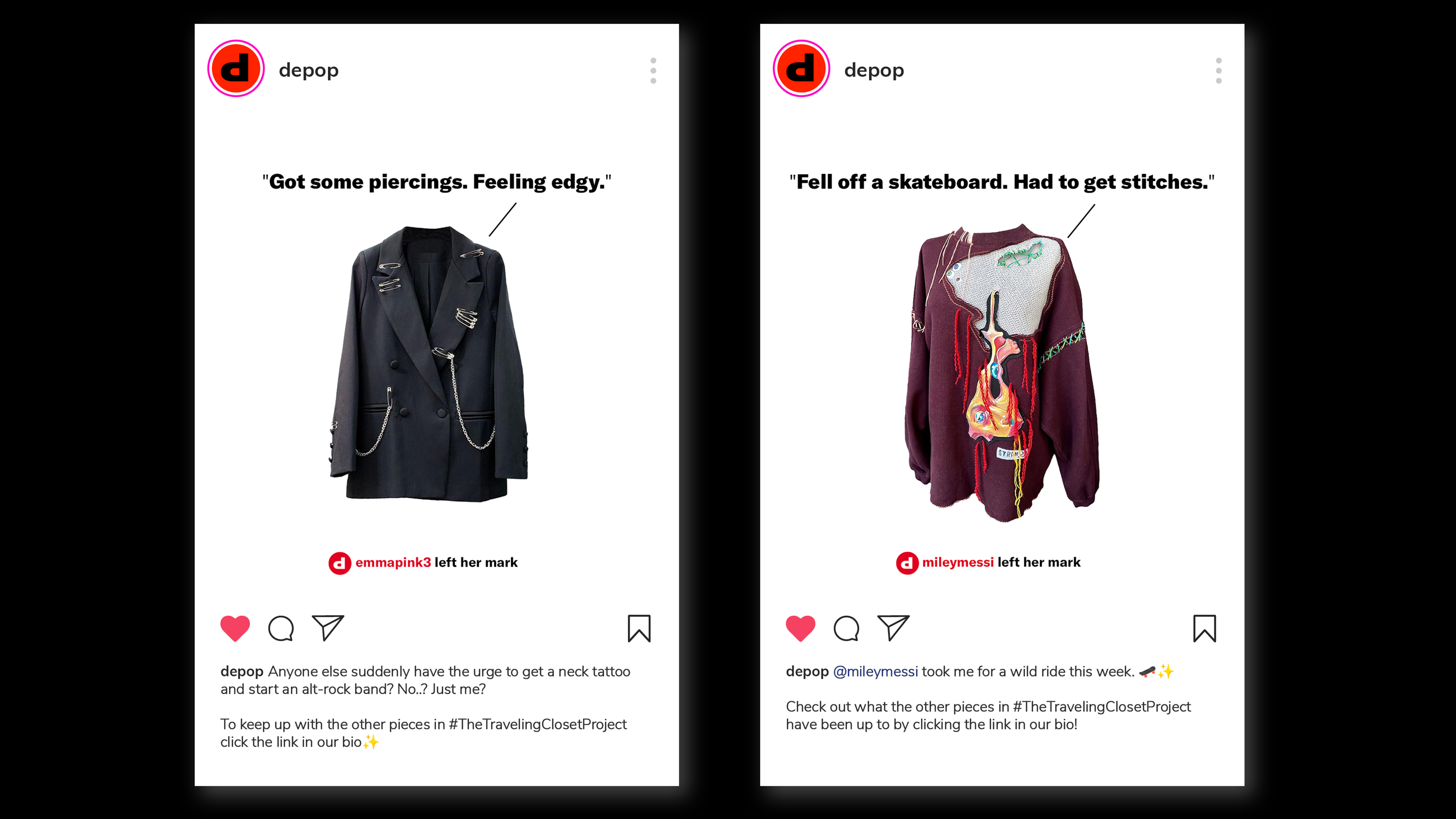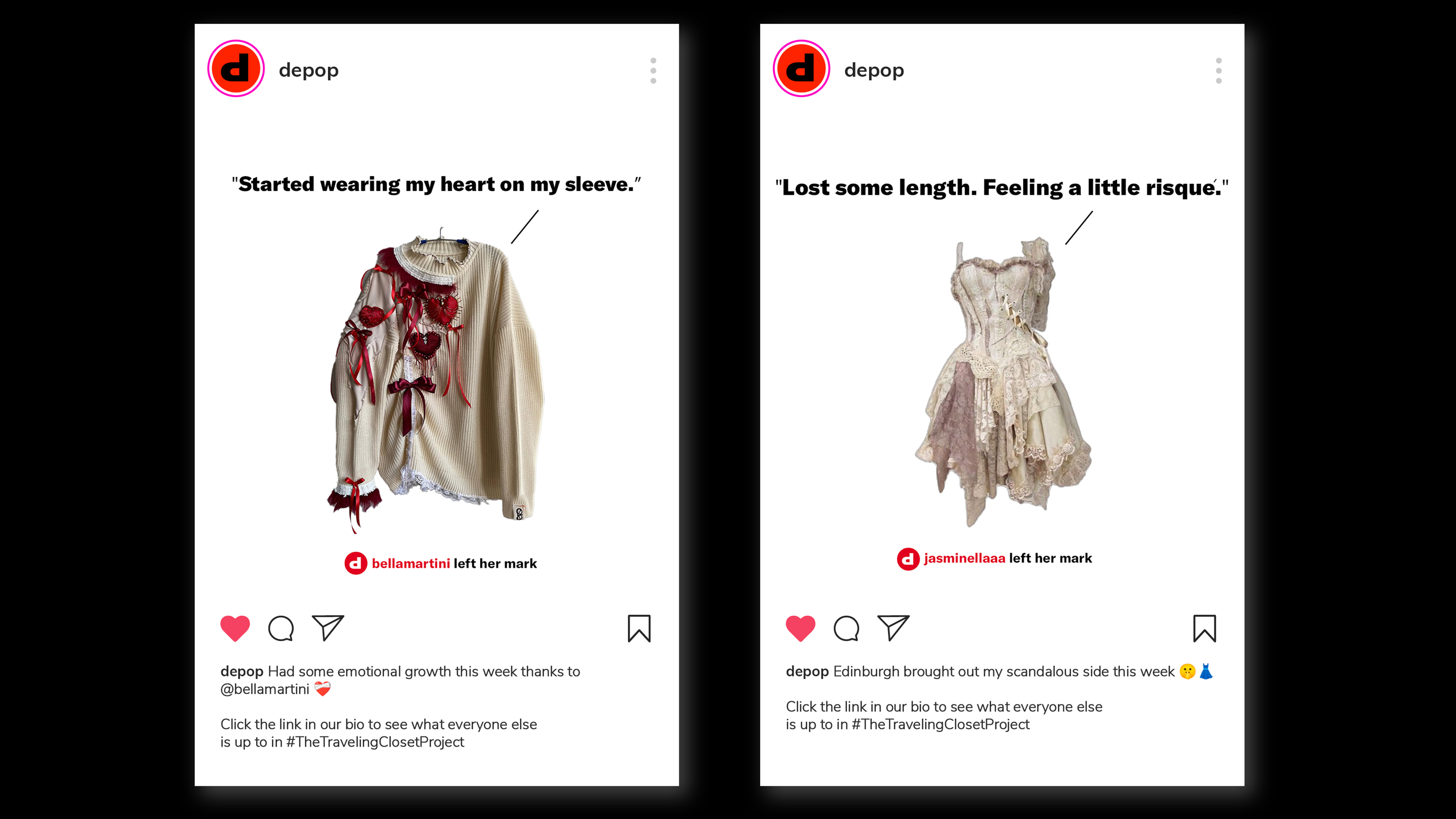 This led to The Traveling Closet Project, a campaign that transforms secondhand fashion into a shared creative project. Seven garments travel through seven UK cities. With each stop, a new participant will personalize the piece before passing it on, showcasing the artistry of the Depop community.