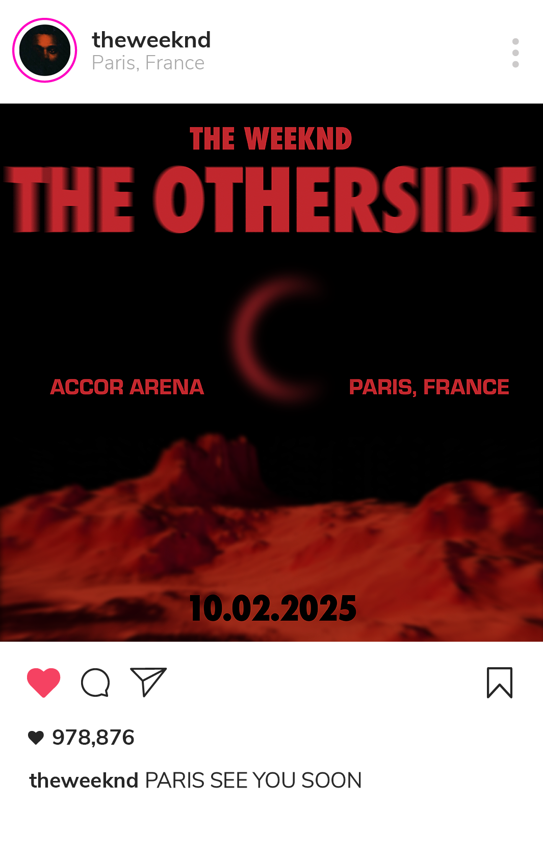 "The Otherside" is a conceptual album inspired by the dark, dreamlike energy of The Weeknd’s music. The campaign introduces a new logo and visual style for his upcoming album and tour.